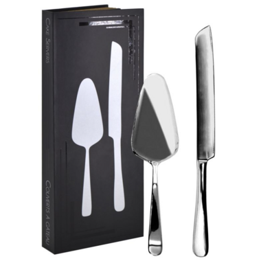 This Cake Serving Set is made from polished stainless steel. Includes a cake knife and cake server. Beautifully packaged in a book-style gift box for gift-giving or convenient storage in a drawer or on a shelf. Hand wash.