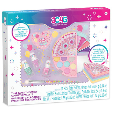 This cosmetic confection is fully baked! Way more than just a slice, this piece of cake holds eyes, lips face and a cosmetic mirror.