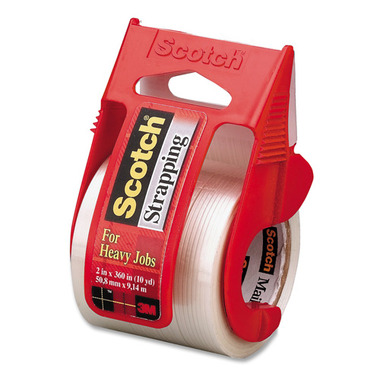 Scotch Strapping Tape with dispenser offers reinforced, heavy-duty, filament tape for banding, sealing and mending. Sure Start dispenser keeps tape from falling back on the roll. Tape also offers a 320 lb. pulling strength and meets U.S. postal regulations.