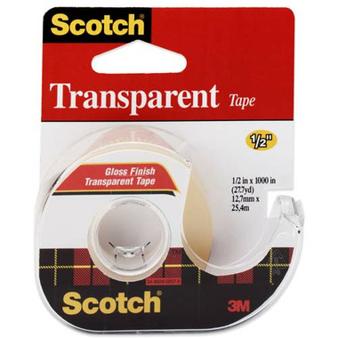 Scotch Transparent Office Tape is a glossy tape with a high-clarity finish. Instant adhesion delivers excellent holding power. Long-aging, moisture-resistant and stain-resistant tape is clear when applied and does not yellow. Tape pulls off the roll smoothly and cuts easily. Ideal for multipurpose sealing, label protection, general purpose wrapping, and mending. Tape comes in a handheld dispenser.