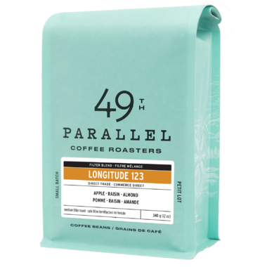 49th Parallel Coffee Roasters Filter Blend Longitude 123 is a medium light filter roast made in small batches.