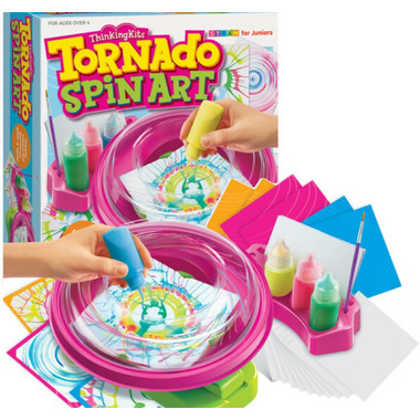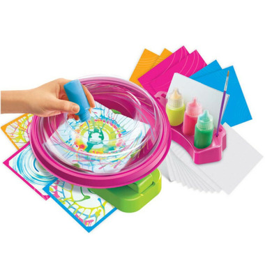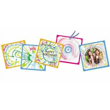 Create colourful artistic patterns with a spin! Simply place the sheet of paper inside the spinner, add paint, then press the button to spin the carousel and create cool designs. When you're done, you can mount your art on a coloured mounting card to show to friends and family! Includes 4 colours of paint, 20 sheets of blank white paper, 6 coloured mounting cards, and detailed instructions.