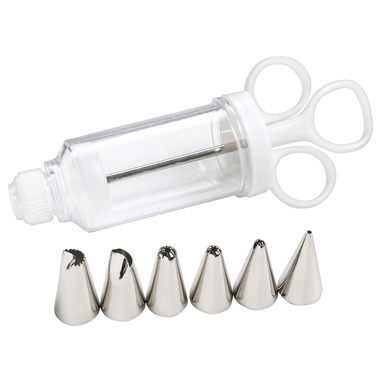 This set is perfect for icing and decorating cakes and cookies! Included in Fox Run's 7 Piece Syringe Icing set are six stainless steel tips and one syringe. The syringe is easy to load and light weight, making it a great addition to any baker's kitchen!