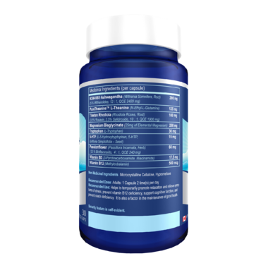 Ingredients: KSM-66Ү Ashwagandha, L-Theanine,Tibetan Rhodiola, Magnesium Bisglycinate, Tryptophan, 5-HTP, Passionflower, Vitamin B3, Vitamin B12