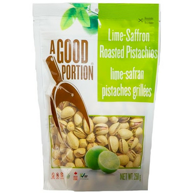 A Good Portion Lime-Saffron Roasted Pistachios are a great tasting snack that come in a resealable pouch. These gluten free, non-GMO pistachios are proudly processed and packaged in Canada with no cholesterol or trans fat.