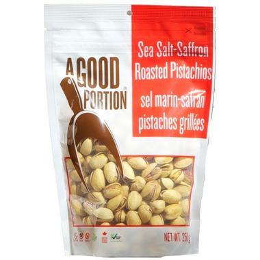 A Good Portion Sea Salt-Saffron Roasted Pistachios are a great tasting snack that come in a resealable pouch. These gluten free, non-GMO pistachios are proudly processed and packaged in Canada with no cholesterol or trans fat.