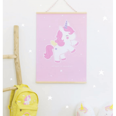 Does your little one believe in unicorns? Then hang this Unicorn poster on the wall of her room. Go for a mini-makeover and combine this poster with some of her unicorn friends featured in this collection. 50 x 70 cm.