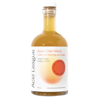 Acid League Apple Cider Maple Living Vinegar gastronomy with gut. For dressings, cooking, cocktails, and creativity. This vinegar has a profile of fruity, mineral and nutty vinegar with notes of orchard, honeycrisp, clementine and tree sap. Pair this with walnurt and goat cheese salads, pork chops, whipped cream topping, caramel desserts, rum cocktails, autumn feasts, and buckwheat pancakes!