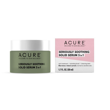 Acure Soothing Solid Serum 3-in-1 is a multi-functional solid serum concentrate with blue tansy and black currant that is 3 products in 1: