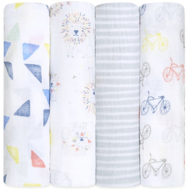 Includes: Pack of four 100% cotton muslin swaddling wraps