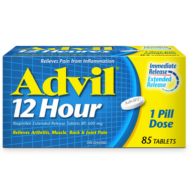 Advil 12 Hour is designed with dual-layer technology for up to 12 hours of pain relief with one pill. A quick burst for relief that’s fast. Extended release for relief that lasts.