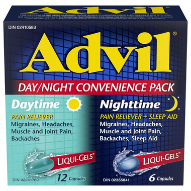 This convenient pack offers pain relief for your day and night pain. Advil Nighttime Liqui-Gels specifically offer relief from nighttime pain and help you sleep so you can wake up and go.