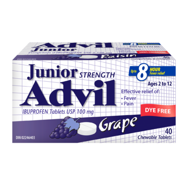 Junior Strength Advil Chewables relieve fever for up to 8 hours, and also relieve pain so your kid can get back to being a kid. These chewable tablets are easy to dose and easy for kids, so you won’t be struggling with zipped lips. And they’re convenient and portable – no dosing cup required. Ages 2-12.