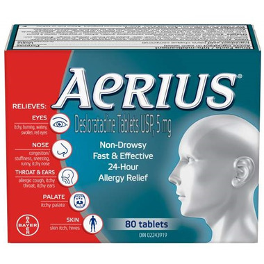 Aerius is clinically proven to provide fast and effective relief of 15 different allergy symptoms. With 5 milligrams of desloratadine per tablet, Aerius is a non-drowsy antihistamine that delivers multi-symptom relief including: itchy, burning, watery, swollen, red eyes, congestion and stuffiness, sneezing, runny nose, itchy nose, allergic cough, itchy throat, itchy ears, itchy palate, skin itch and hives. Whether its plants or animals, indoors or outdoors, Aerius is backed by science to relieve your allergy symptoms. Plus, this long-lasting formula lets you do the things you like, all year round, without your allergy symptoms getting in the way. Aerius is pharmacist and doctor recommended. To be sure this product is right for you, always read and follow the label.