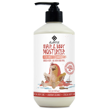 Alaffia’s playful coconut strawberry two-in-one moisturizing lotion, prepared with Ethically Traded virgin coconut oil, playful strawberry and hibiscus, leaves your child's hair and skin soft and smooth. For everyday use on all skin and hair types.
