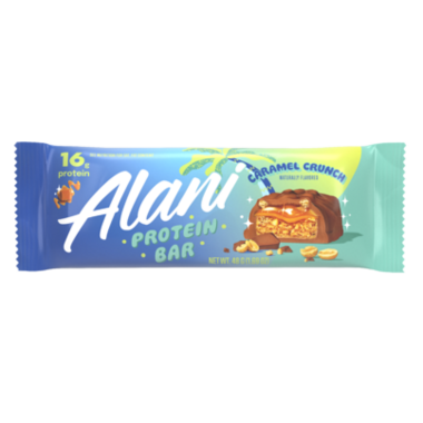 This chewy Caramel Crunch Alani Protein Bars are gluten free and packed with 16g of protein, 190 calories and 8g of sugar. Made with a gooey, melt-in-your-mouth caramel center, we top each treat with salty peanuts and sweet chocolate.