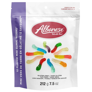Albanese 12 Flavour Mini Gummi Worms are gluten free, fat free and low sodium.