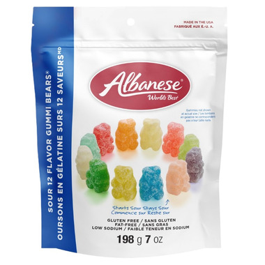 Albanese Sour 12 Flavours Gummi Bears are gluten free, fat free and low sodium.