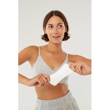 Organic cotton (top sheet and absorbent core), Plant-Based biopolymer (backsheet and wrapper), Adhesive (under the pads, no contact with the skin), Silicone (release paper).