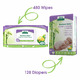 Bundle Includes: Size NB 4 x 32ct diapers and 6 x 80ct wipes.