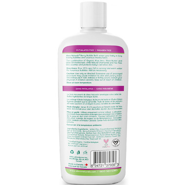 A unique formulation of long-lasting, luxurious berry bubbles that makes bath time a fun time, with no harsh chemicals. This moisturizing bubble bath is specially formulated to avoid the berry fragrance from lingering on the skin. The combination of Organic Aloe Vera, Organic Shea Butter and Organic Olive Oil moisturizes, while Natural Chamomile and Tea Tree Oils soothe & protect baby's sensitive skin.