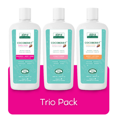 Aleva Naturals COCOBERRY Shampoo + Body Wash is specially formulated with a blend of Jojoba and Aloe Vera to naturally soothe, hydrate and clean sensitive skin. Aleva Naturals COCOBERRY Conditioner is enriched with hydrating Jojoba and Coconut Oils to calm tangles and reduce hair breakage, leaving hair silky smooth. Aleva Naturals COCOBERRY Body Lotion is a unique, non-greasy, gentle moisturizer made with a blend of Shea Butter, Jojoba Oil and Aloe Vera that helps to nourish, soothe & soften dry and sensitive skin. This trio is natural, plant-based and infused with their unique COCOBERRY scent, making bath time more fun!