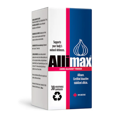 Allimax 180 mg Allisure powder. Allisure, certified bioactive stabilied allicin. Supports your body's Natural defences. Traditionally used in Herbal Medicine to help relieve the symptoms associated with upper respiratory tract infections and catarrhal conditions.