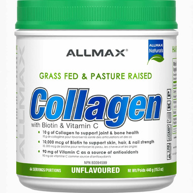Collagen is the most abundant structural protein in the human body, making up about 2535% of your total protein content. It forms the connective framework of tissues like skin, tendons, ligaments, cartilage, and bones, acting as the ֓glue that holds your body together. In supplement form, collagen is typically hydrolyzed into smaller chains called collagen peptides, which are easier to digest and absorb. These peptides deliver key amino acids that support tissue repair and regeneration. ALLMAX NATURALS Collagen Peptides Powder provides 10?g of bovine-sourced Type I, II, and III collagen per serving, sourced from grass-fed, pasture-raised cattle. This formula is also enhanced with vitamin C and biotin. Vitamin C helps stimulate your bodyԒs natural collagen production and provides antioxidant protection, while biotin supports healthy hair, skin, and nails.