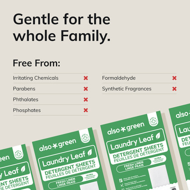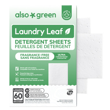 Proudly made in Canada, Also Green Laundry Leaf detergent sheets offer a simple, modern way to do laundry without the bulky plastic jugs. Each lightweight sheet delivers a concentrated cleaning formula powered by stain-fighting enzymes and gentle plant-based ingredients. The pre-measured sheets dissolve quickly in any water temperature and work in all washing machines, including HE. Directions: Just toss a sheet into the drum and enjoy powerful cleaning with no measuring, no mess, and no plastic waste.