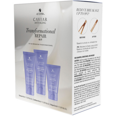 This shampoo, conditioner and hair masque trial kit will have transformative repair for damaged hair with caviar bond enforcing technology and maracuja oil. Helps seal hair cuticles that have been damaged through chemical processes or physical stress.