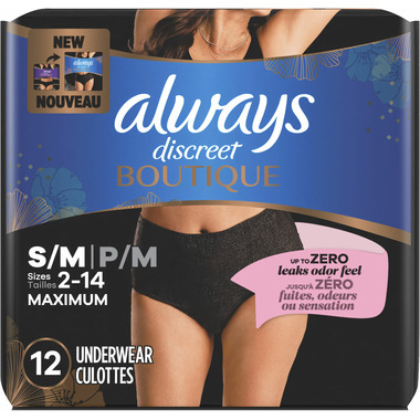 Who said women should have only one style of bladder leaks underwear? Always Discreet Boutique Underwear Small/Medium comes in a deep black colour with a hipster-cut design that feels like real underwear.