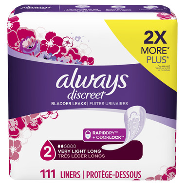 Get secure overactive bladder protection in a liner you can barely feel. Unlike period liners, ALWAYS DISCREET Incontinence liners keeps you drier and absorbs 2X more than the leading regular period liner. With ALWAYS DISCREET's RapidDry™ core that turns liquid to gel to lock away bladder leaks and OdorLock™ Technology to help you feel fresh and confident all day.
