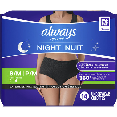 Finally, long-lasting Overnight bladder leak protection that feels as good as it looks. Say 'never again' to bulky adult diapers and 'hello' to Always Discreet disposable incontinence underwear for women with a smooth and secure fit that looks and feels like real underwear. The form-fitting design of Always Discreet Incontinence and Postpartum Underwear for women hugs your curves with a soft, silk-like fabric so you can walk with poise and confidence. Its the delicate, barely noticeable look you want in disposable panties for women, paired with the leak-proof protection you deserve. The super absorbent core turns liquid to gel to stop bladder leaks in seconds for up to 12 hours of reliable overnight leak-free protection. Exclusive OdorLock Technology neutralizes odors instantly and continuously, to help you feel confidently fresh and dry all day long. Unexpected leaks donҒt stand a chance with the special side LeakGuard design that helps stop bladder leaks at the leg, where they happen most. Get incredible protection with the disposable underwear women can depend on.
