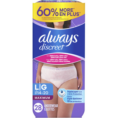 Try Always Discreet incontinence underwear for women. These reimagined adult diapers for women have up to zero leaks, zero odor, and zero bulk when wet for incontinence protection you can depend on. Designed to fit up to 95% of body shapes, these reimagined adult diapers for women range from sizes 2-26W+. Perfect for everyday use and also ideal as postpartum underwear, these products have a cottony soft 4 way stretch that fits like real underwear. These innovative disposable underwear for women feature a super absorbent core that wicks away moisture and turns liquid to gel, ensuring up to 12 hours of maximum absorbency and up to 100% leak-free protection you can depend on. These reimagined adult diapers for women also have LeakGuards that help contain leaks and prevent incontinence overflow and Odorlock technology that continually neutralizes odor. These lightly scented incontinence underwear for women are 40% drier* (*vs. leading brand) for all day freshness and confidence. As an HSA/FSA eligible product, managing your incontinence has never been easier. Embrace life without limits and choose Always Discreet - reimagined adult diapers for women you can depend on!