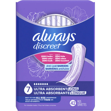 Looking for dependable, strong, bladder leak protection that's barely noticeable under clothes? Experience incredible bladder leak and postpartum incontinence protection in a surprisingly thin and discreet incontinence pad for women. Always Discreet disposable Incontinence Pads for women provide the comfort you need with up to the 100% leak-free protection you deserve. Thanks to a unique absorbent core that keeps your skin dry by absorbing bladder leaks in seconds, youll be able to stay comfortable and feel fresh for hours. Walk with poise and confidence knowing the RapidDry core has double-layer protection that absorbs fluid in seconds and holds up to 5x the average leak, giving you extra bladder control protection where you need it most. The LeakGuards help keep wetness away from the sides and stop leaks at the legs where they happen most, while the lightly scented OdorLock technology neutralizes odors instantly and continuously. Don't let bladder leaks get in the way of your day. Simply find your best fit with the Always Discreet sizing chart to find your absorbency need and then underwear size to get bladder control pads for women with protection you can depend on.