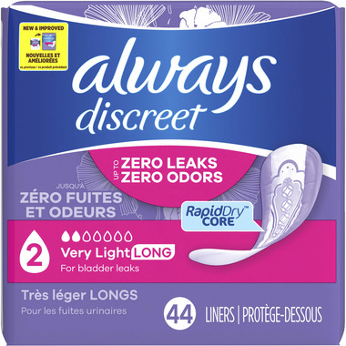 Bladder leaks shouldn’t hold you back. With Always Discreet, they don't have to. Start living life uninhibited by a weak bladder and urinary incontinence with protection you can count on and feel comfortable wearing. Always Discreet Liners for incontinence are designed to fit your body and your lifestyle, with a slim profile you can barely even feel! And since these revolutionary panty liners stay comfortably in place and fit discreetly under your clothing, you can walk with poise and confidence every day. Now made with an improved end-to-end core for better overactive bladder protection and all-day comfort (when compared to previous Always Discreet products), incontinence liners with their layered RapidDry core turn liquid into gel to lock leaks away and keep you dry. Side LeakGuards help keep wetness from reaching the edges to avoid messes, so you can leave any worries of adult incontinence behind. Find Always Discreet incontinence liners for women in the size and absorbency level that's right for your needs. If sneezing or laughing causes bladder leaks, Always Discreet Very Light Liners offer the ideal amount of protection. If you feel like you may need more coverage, look for liners with a longer length and greater absorbency. And remember that adult incontinence products from Always are HSA/FSA eligible, so check with your provider for plan coverage.