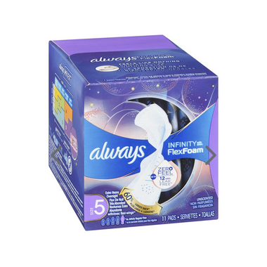 - Up to 12 hours Zero Leaks, Zero Feel with Always Infinity FlexFoam Extra Heavy Overnight Absorbency period pads