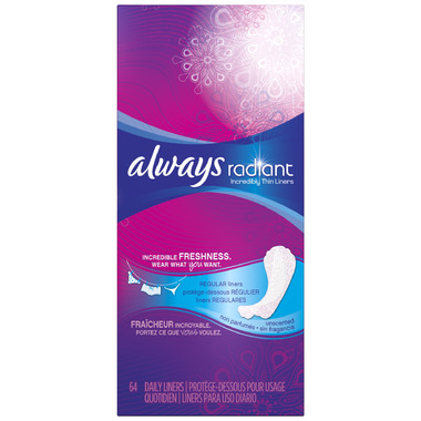 Daily freshness. Artfully designed. Alwaysè thinnest and most flexible protection, Always Incredibly Thin Radiant panty liners have edges that fold to fit multiple panty styles comfortably. Ideal for an everyday clean feeling, light-flow days, and tampon back-up protection.