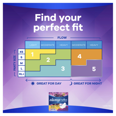 ALWAYS Radiant Size 1 Regular Sanitary Pads with wings offer up to 100% leak and odour-free protection and feature Zero Feel, so you can wear what you want all month long. These incredible sanitary pads with FlexFoam have powerful moisture-wicking technology that pulls wetness away from your skin, keeping you clean and fresh. ALWAYS Radiant Sanitary Pads are lightly scented, come in colourful designs, and offer quiet wrappers for discretion. Use the ALWAYS My Fit sizing chart on every package or on this page to find your fit for superior protection.