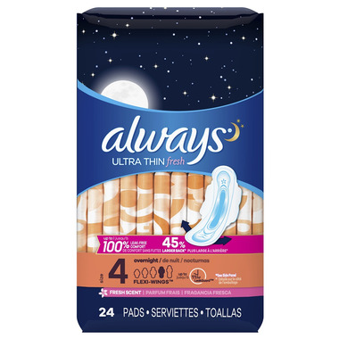 Get up to 100% leak-free comfort no matter how you sleep with Always Ultra Thin pads. Always features RapidDRY, which absorbs 40% faster than the leading generic brand to help you stay clean and dry. Did you know that Always has five sizes so you can find your best fit? For up to 20% more coverage, move one size up. Choose the best protection based on your flow AND panty size with Always MyFit sizing system. Always Ultra Thin Size 4 Overnight Pads with Wings has a 45% larger back* to help stop leaks at night. These pads have a LeakGuard Core that absorbs in seconds for up to eleven hours of protection, plus a flexible fit that moves with you while you sleep. And thanks to the pads’ fresh scent, you can enjoy feeling clean and fresh all night long. *vs. Always Ultra Thin Regular Pads with Wings
