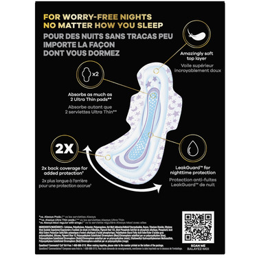 Thoughts of period leaks keeping you up at night? Always ZZZ Overnight Pads have you covered for leak-free period nights, no matter how you sleep. The pads are designed specifically for night as they feature double back coverage* and absorb as much as two Always Ultra Thin pads.