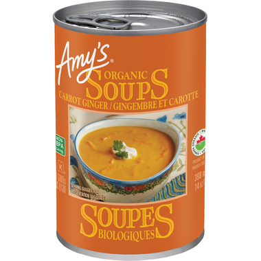 Amy's Kitchen Organic Carrot Ginger Soup is ready to serve. This vibrant soup will warm your heart and body! Made with organic carrots, ginger, spices and a touch of cream; the ingredients may be simple, but the depth of flavour will surprise you!