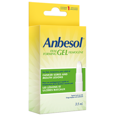 Anbesol Film Forming Gel is a mucoadhesive gel forming a mechanical barrier which adheres to the oral mucosal surface to provide fast and temporary pain relieve from canker sores and mouth lesions.