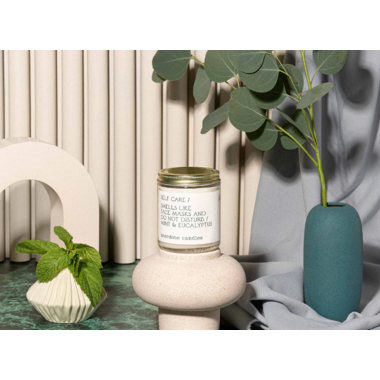 Self Care Smells like face masks and do not disturb. This aroma is as invigorating as it is relaxing. Awake your senses with vibrant notes of citrus, verbena, and mint leaf. Then relax and unwind with soothing base notes of lavender, moss, and eucalyptus for some much needed serenity.