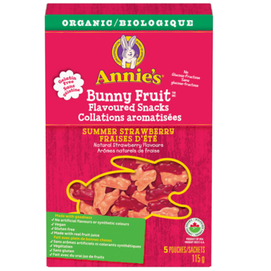 Summer Strawberry fruit snacks are enlivened with the taste of juicy strawberries. Certified organic, these bunny-shaped fruit snacks are made with real fruit juice and packed with 100% Daily Value of Vitamin C.
