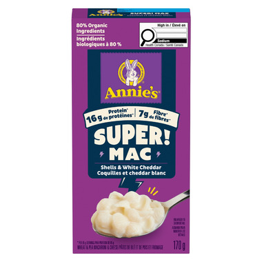 Annie's Super Mac Shells & White Cheddar are made with wheat & pea macaroni and 80% organic ingredients.