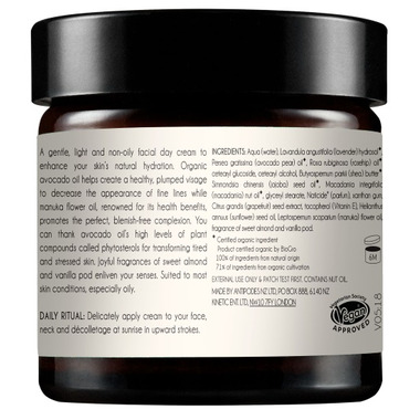A gentle, light and non-oily facial day cream. Nutrient-rich avocado oil helps create a healthy, plumped looking visage to decrease the appearance of fine lines. Antibacterial manuka flower oil promotes the perfect, blemish-free complexion.
