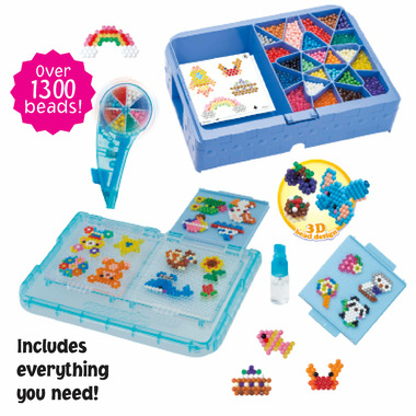 Includes over 1300 jewel and solid beads in 24 colours, 2 flip trays and layout table, case with bead palette, 3 double-sided template sheets, sprayer, rainbow bead pen and instructions.