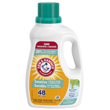 ARM & HAMMER Sensitive Skin plus Fresh Scent is a liquid detergent specially designed for sensitive skin, and it smells great too! The advanced dye-free laundry detergent has a light, fresh fragrance designed and clinically tested to be gentle on sensitive skin. This liquid laundry detergent harnesses the pure, freshening power of ARM & HAMMERٙ Baking Soda to wash away dirt and odours. After each wash, your laundry is left clean and smelling great with a fresh, hypoallergenic scent. This low-suds formula provides a clean rinse and is compatible with both standard washers and today's energy-conscious High-Efficiency (HE) machines.