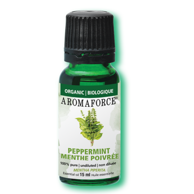 Aromaforce Peppermint Essential Oil (Mentha piperita) is steam distilled from flowering herb and has a fresh, herbaceous and mentholated fragrance.